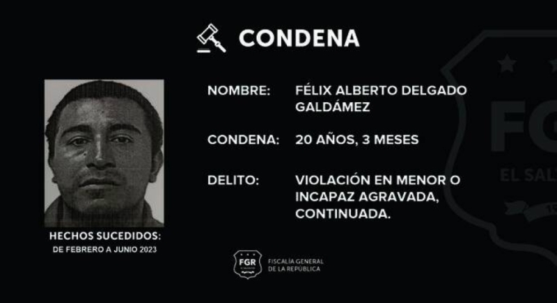 La Fiscalía General de la República (FGR) ha informado sobre la condena de Félix Alberto Delgado Galdámez a 20 años y tres meses de prisión por violación en menor de edad, cometida en varias ocasiones entre febrero y junio de 2023 en el distrito de Candelaria, Cuscatlán.