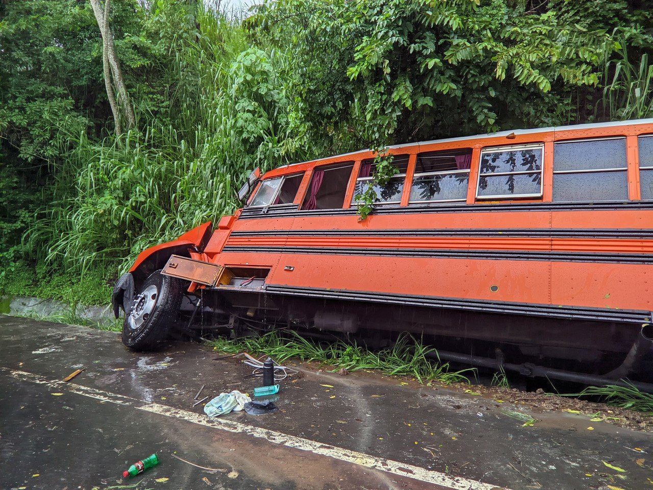 El incidente ocurrió después de las 2:00 p.m., cuando la zona estaba bajo condiciones de lluvia. Según las primeras investigaciones, el conductor del autobús perdió el control del vehículo, que se salió de la carretera y quedó encunetado a la orilla.