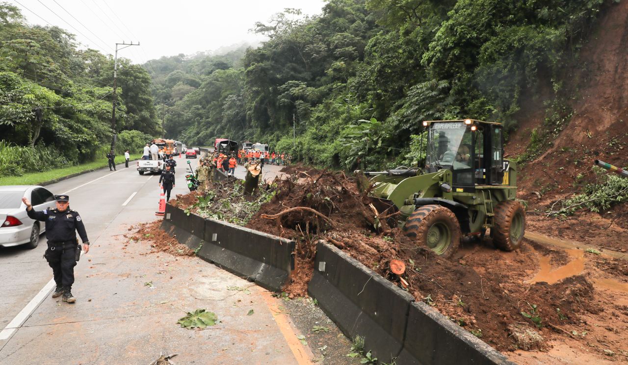 Este lunes, agentes de la Policía Nacional Civil (PNC) atendieron una emergencia causada por un derrumbe en la carretera hacia el Puerto de La Libertad, en Santa Tecla, específicamente en Ayagualo.