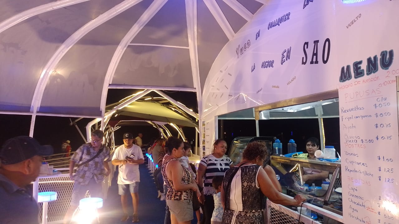 La pasarela cuenta con iluminación LED, piso alfombrado y capacidad para 60 personas. Además, se adecuó un espacio tipo cocina desde donde se ofrecen pupusas y otros platillos típicos, lo que ha dinamizado la economía local y atraído tanto a residentes como a visitantes.